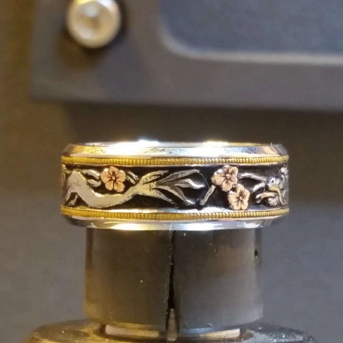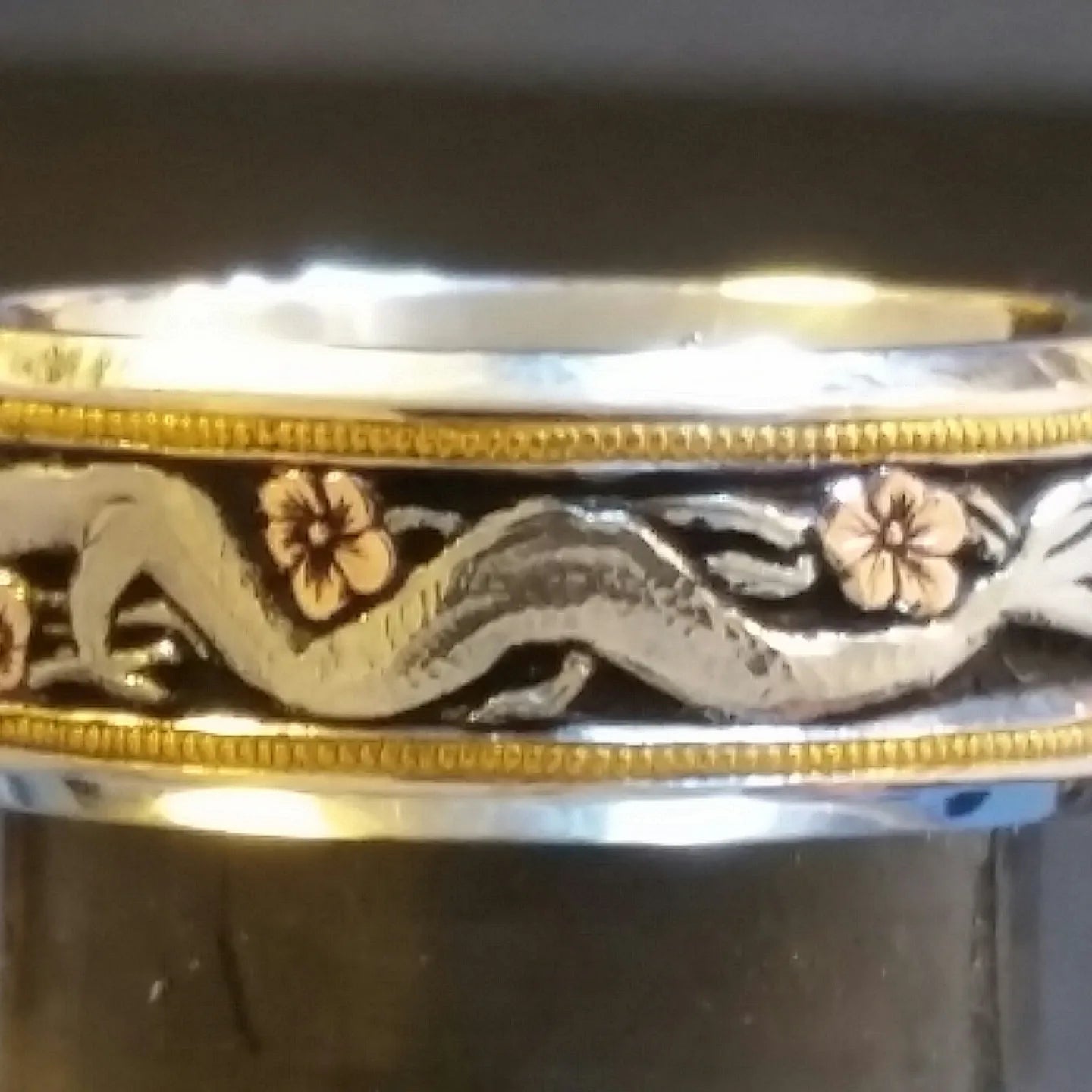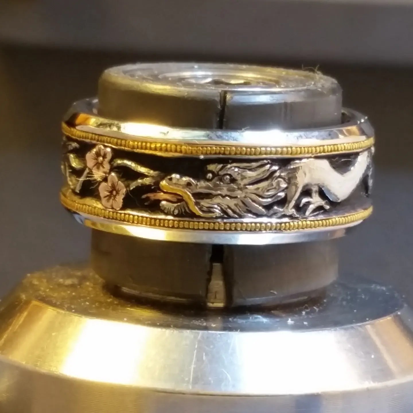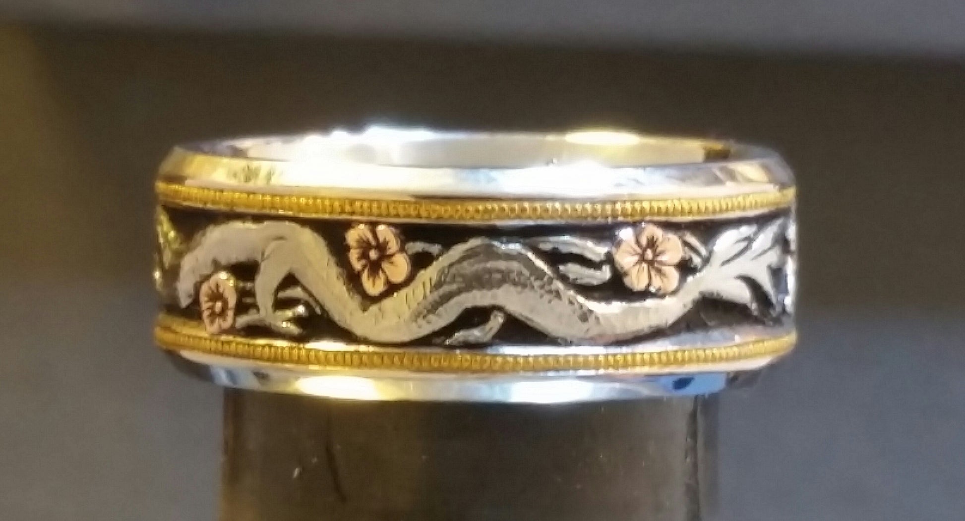 Stainless steel band with deep relief hand engraved dragon with 24 karat yellow gold inlayed accents and 14 karat rose gold herry bloom. SOLD