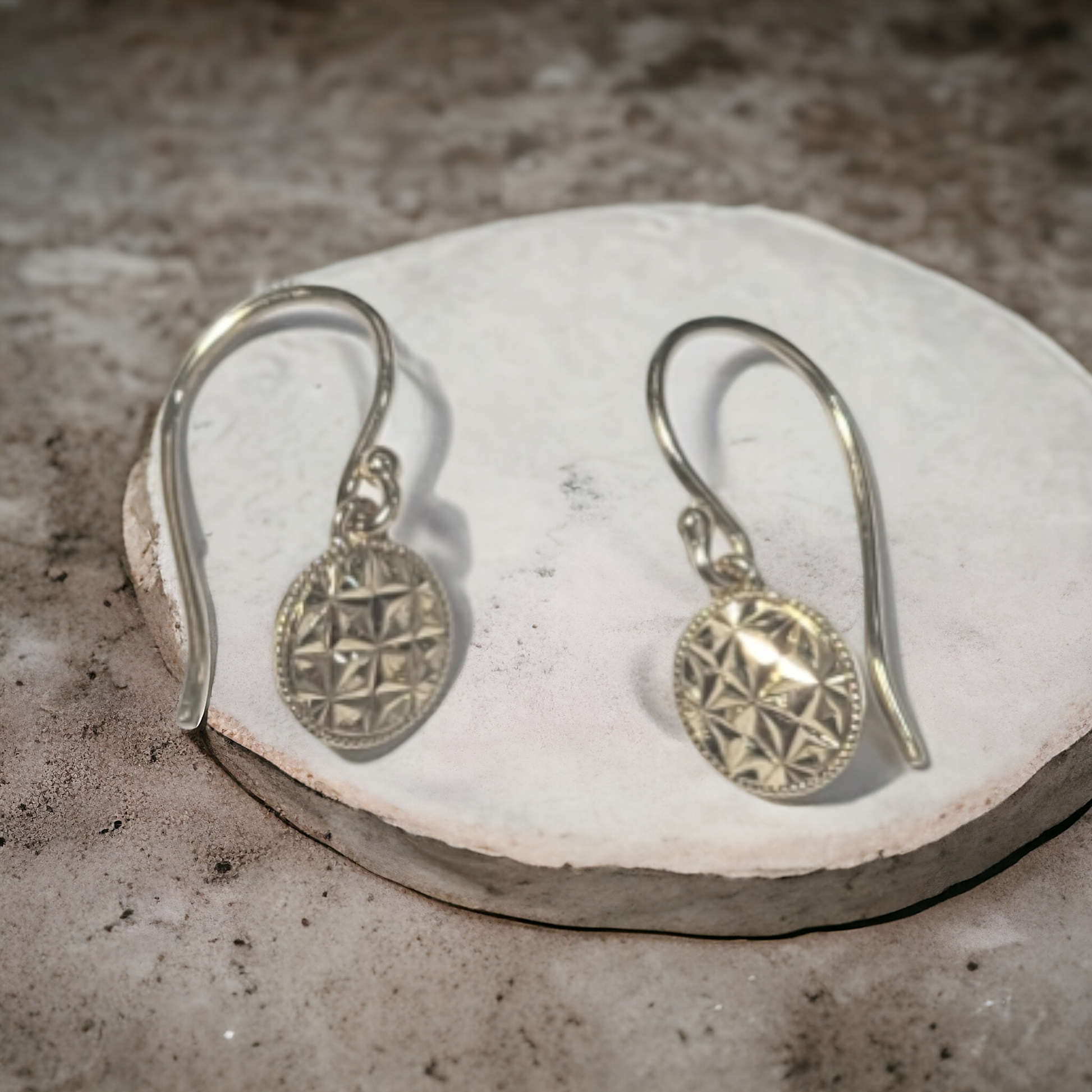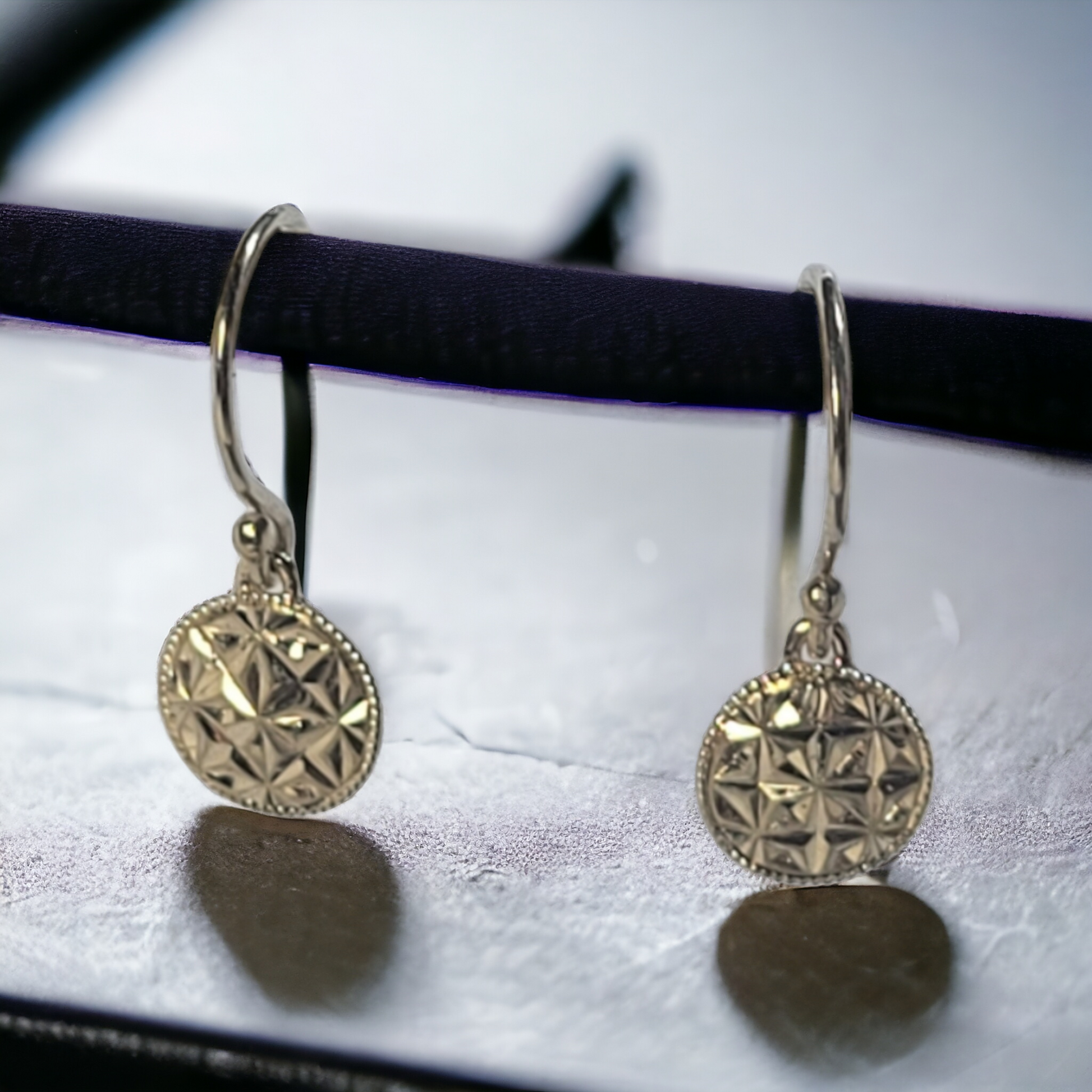 Indulge in the luxurious beauty of our 14 karat yellow gold dangle earrings. Hand engraved with intricate details, these earrings are sure to make a statement. The shepherd hook design adds a touch of elegance and ensures a secure fit. Elevate any outfit with these stunning earrings!