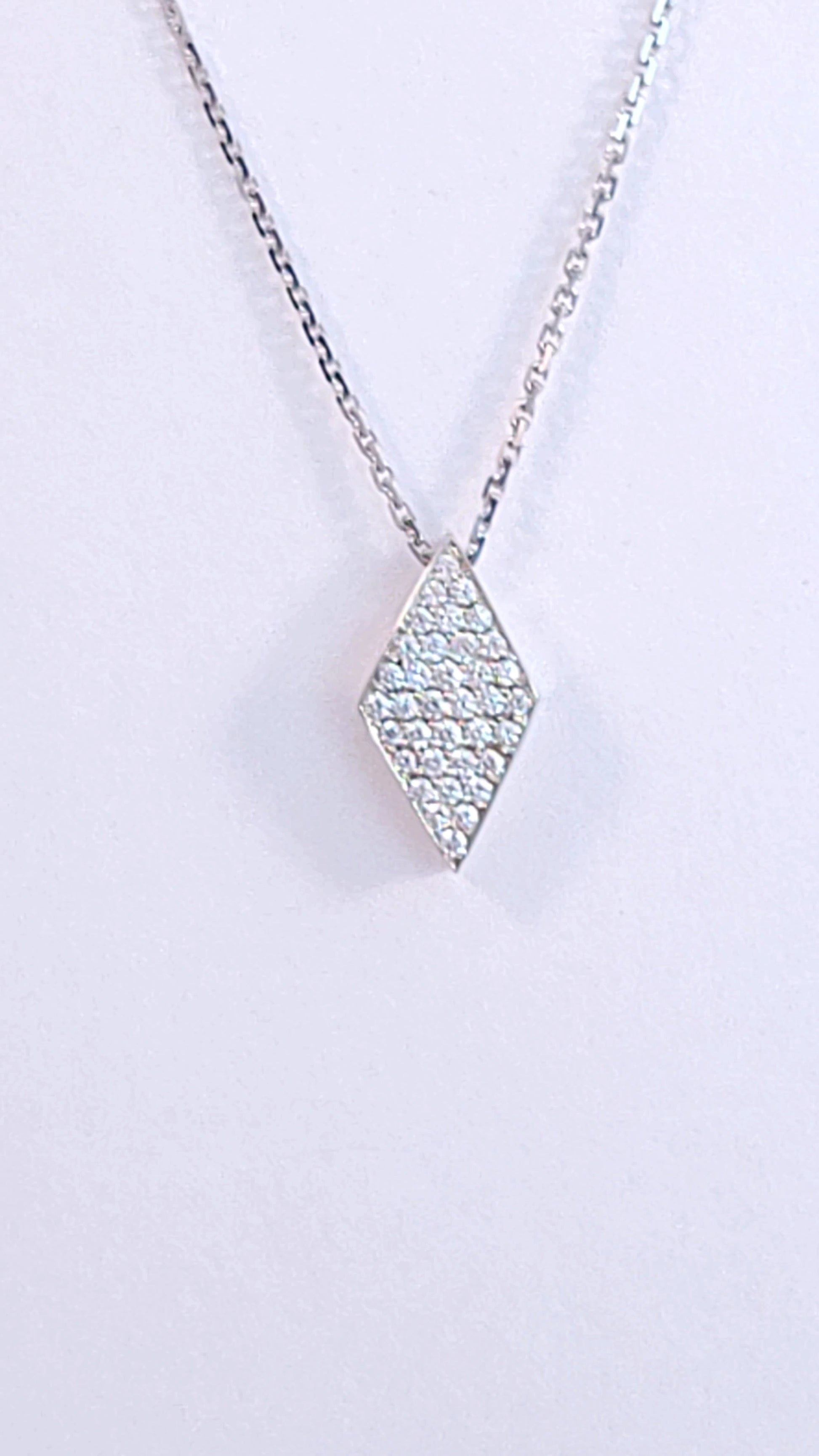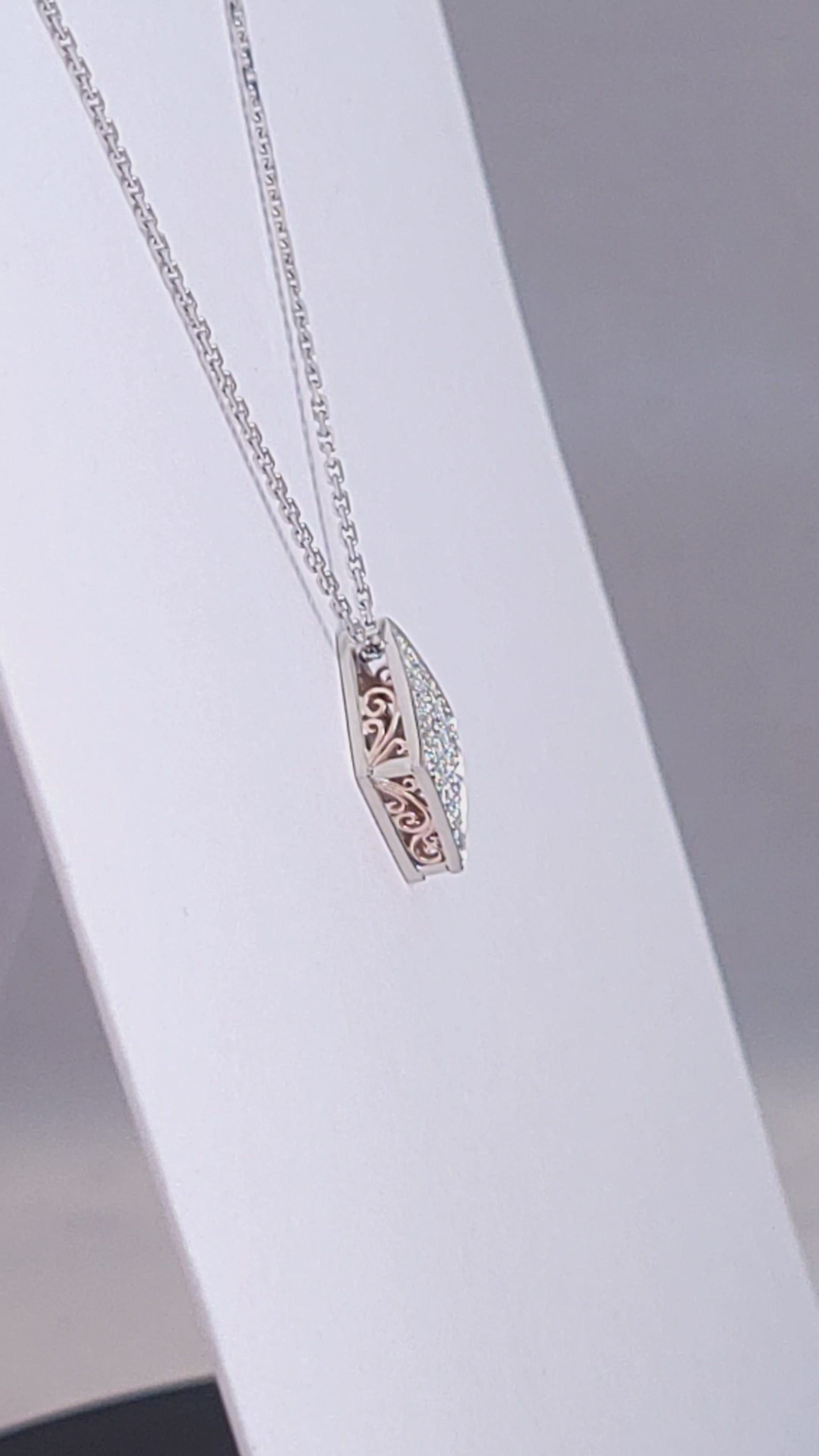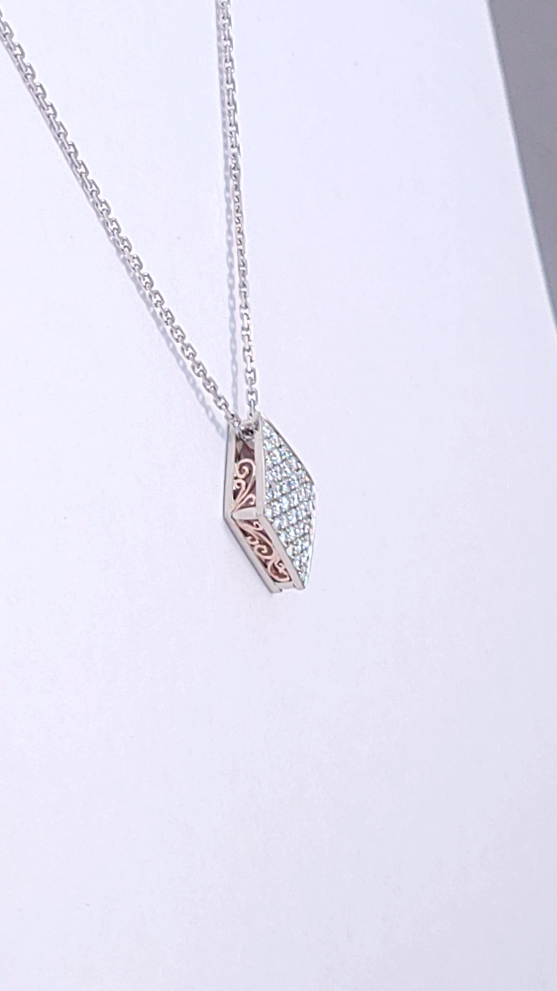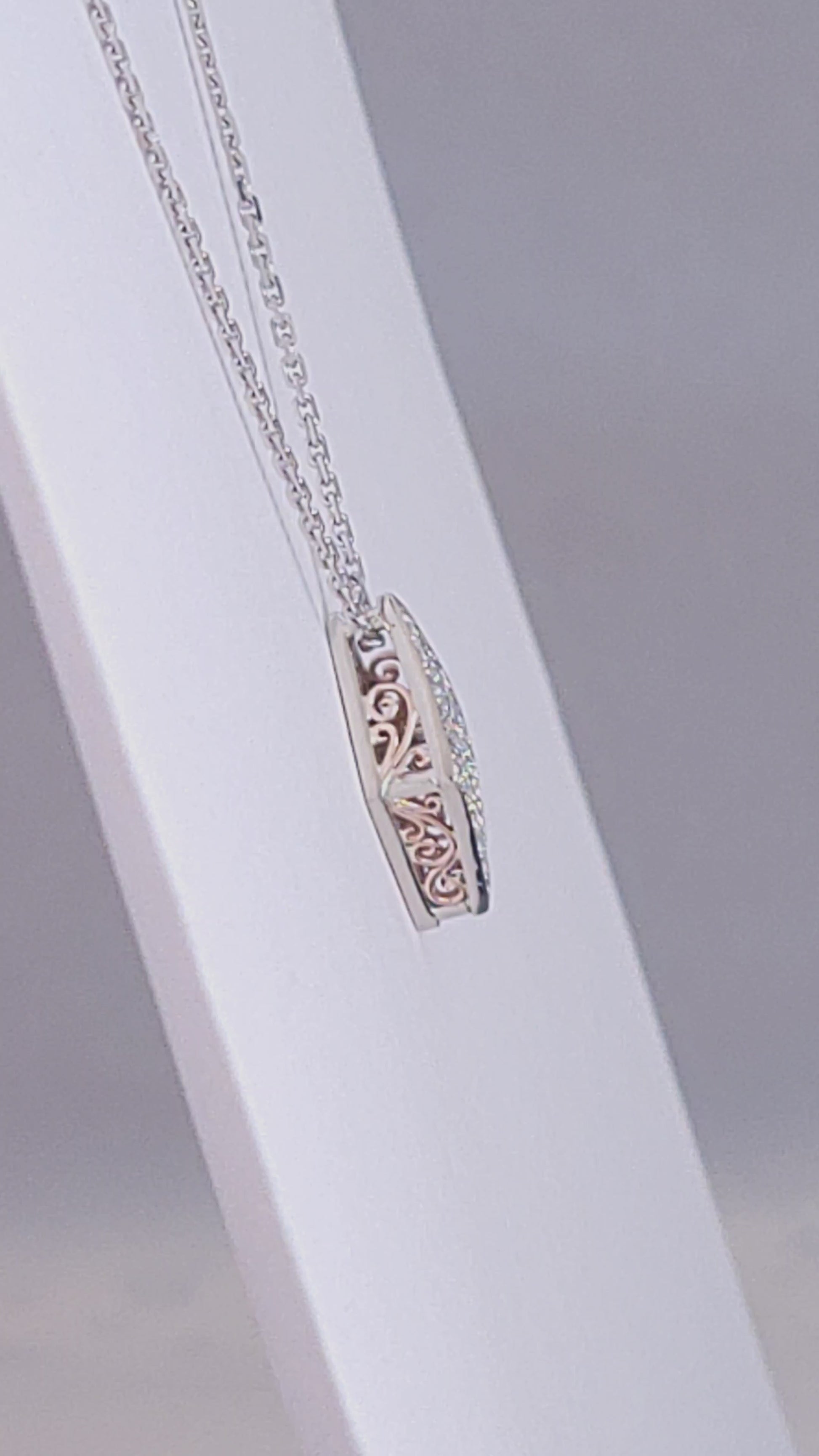 Hand fabricated 14kt white and rose gold pendant with 36= .33ctw natural earth minded VS, G-H pave' set round full cut diamonds. Made with ethically sourced diamonds and 100% recycled gold. Hand fabricated and set by Colin Skelly.